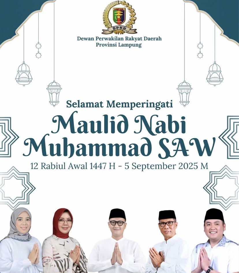 BANDAR LAMPUNG – Pimpinan dan Anggota DPRD Provinsi Lampung menyampaikan ucapan selamat memperingati Maulid Nabi Muhammad SAW, 12 Rabiul Awal 1447 Hijriah.