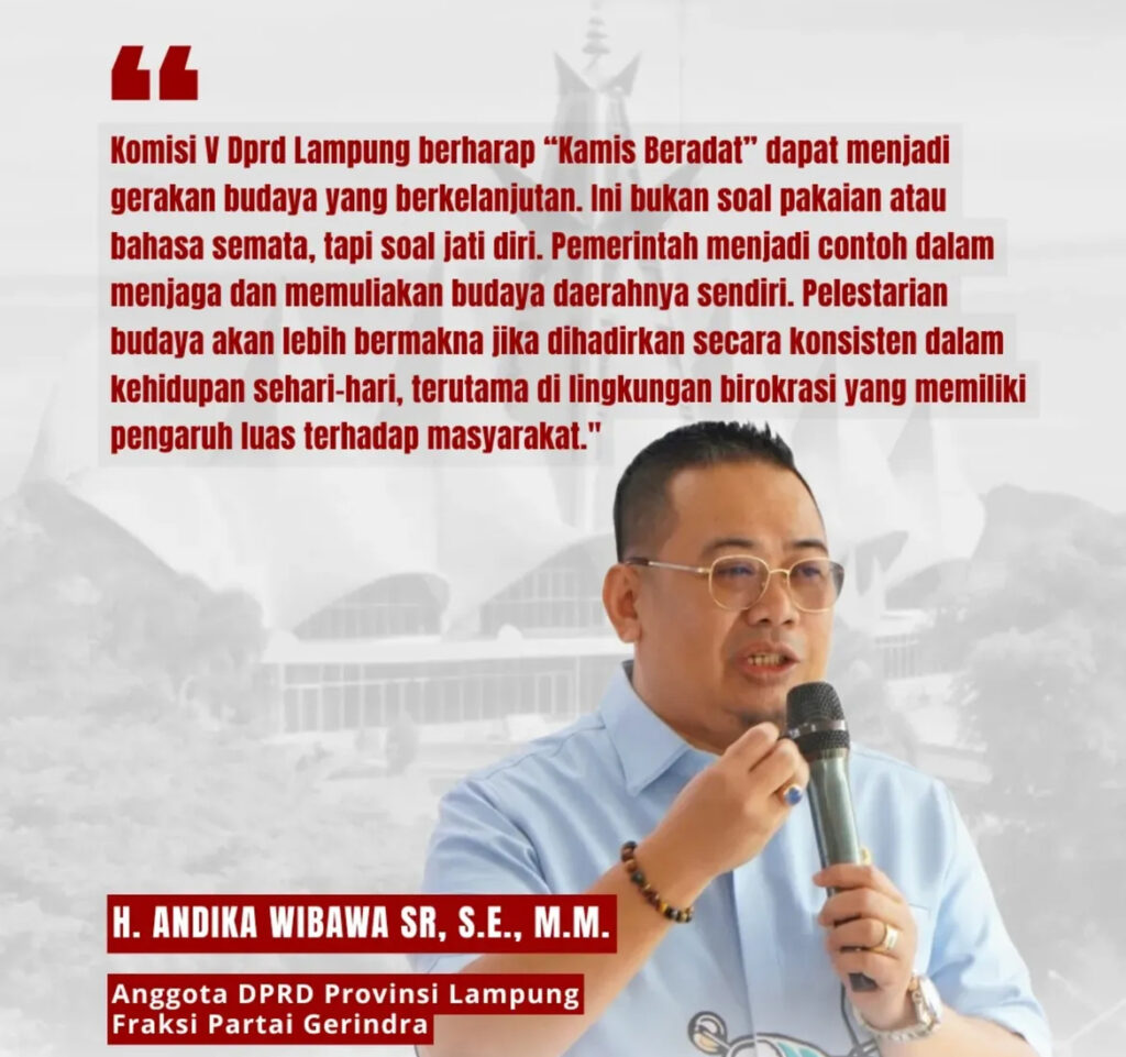 Anggota Komisi V DPRD Provinsi Lampung, Andika Wibawa, mengatakan kebijakan tersebut menjadi langkah penting dalam menjaga eksistensi adat dan budaya Lampung yang dinilai semakin tergerus oleh perkembangan zaman.