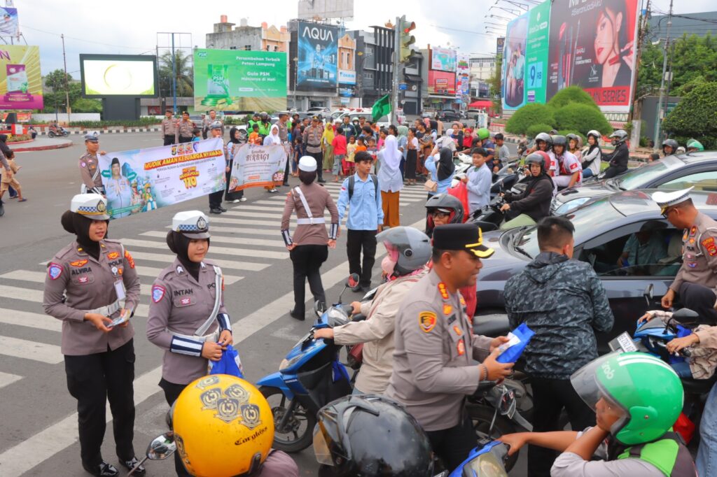 “Hari ini kita lakukan sosialisasi tagline mudik 2025 maupun hotline mudik 110 kepada pengendara yang melintas di Tugu Adipura, dengan dibarengi kegiatan sosial bagi bagi takjil,” Kata Kombes Pol Alfret, Sabtu (15/3/2025).